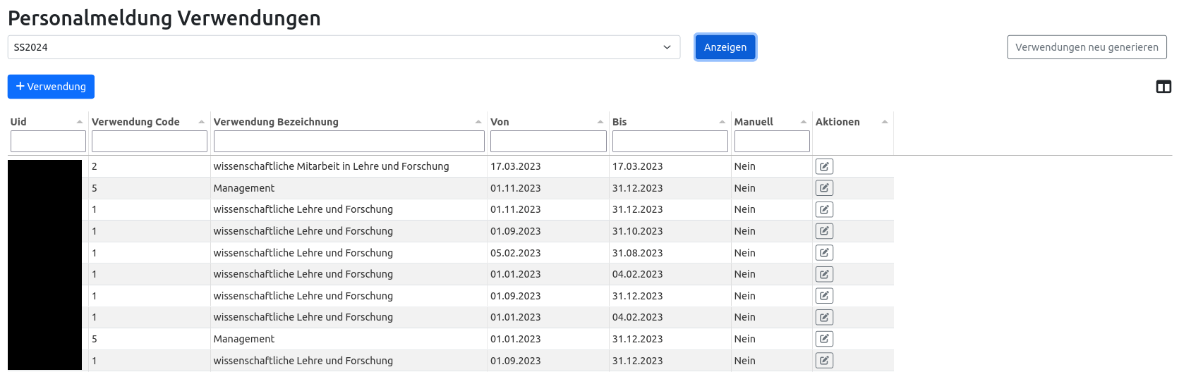 Alternativ kann die Verwendungsgenerierung durch die Benutzeroberfläche angestoßen werden (Button „Verwendungen neu generieren“, siehe Abschnitt Personalmeldung Benutzeroberfläche).
