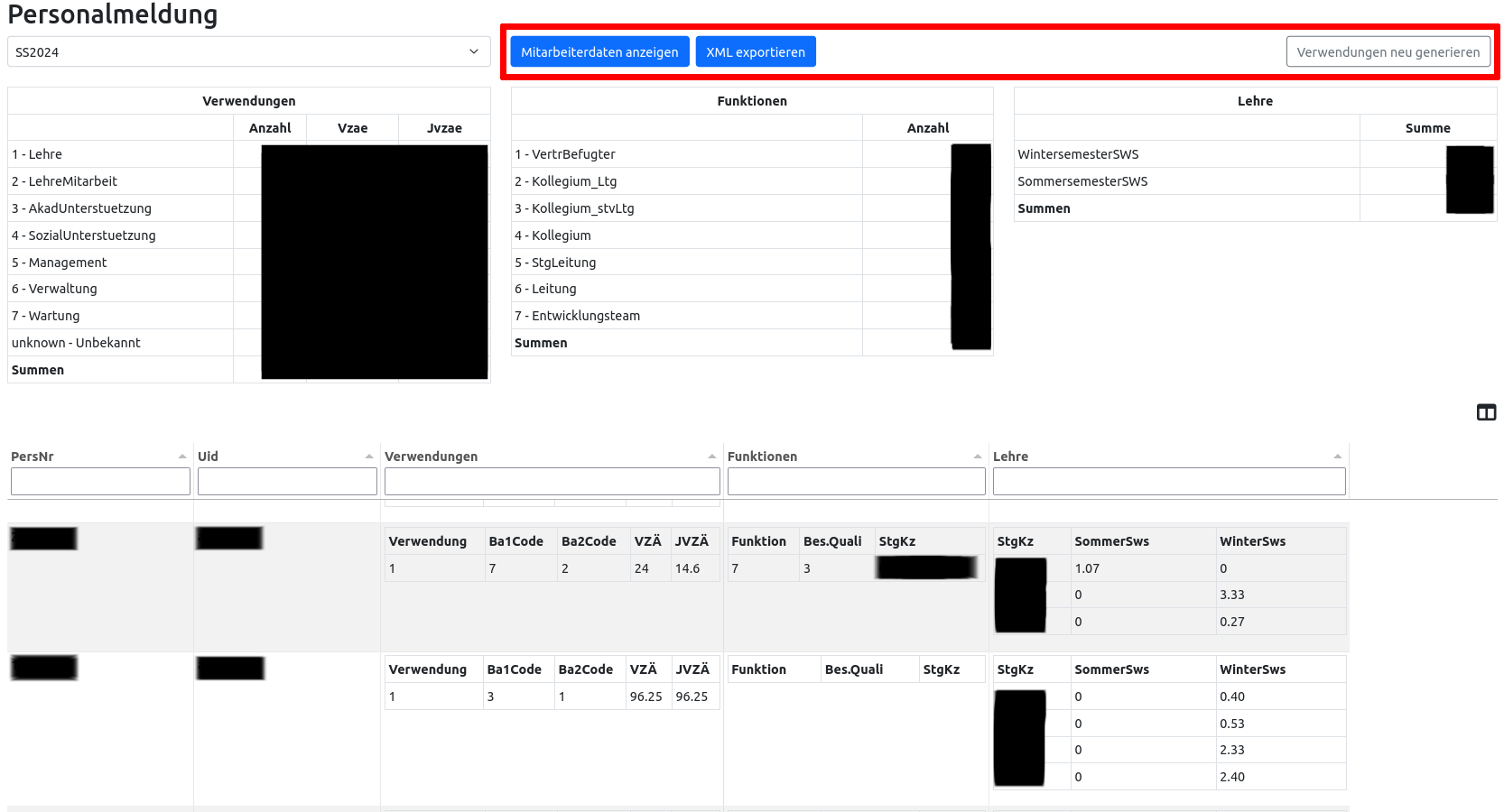 Unter extensions/FHC-Core-BIS/Personalmeldung wird eine Benutzeroberfläche bereitgestellt. Sie ermöglicht die Generierung und das Anzeigen der Verwendungen, Berechnung und Anzeigen der Vollzeitäquivalenzen sowie XML-Export der Mitarbeiterdaten. Außerdem wird eine Übersicht der Personaldaten mit Anzahl und Summen angezeigt.
