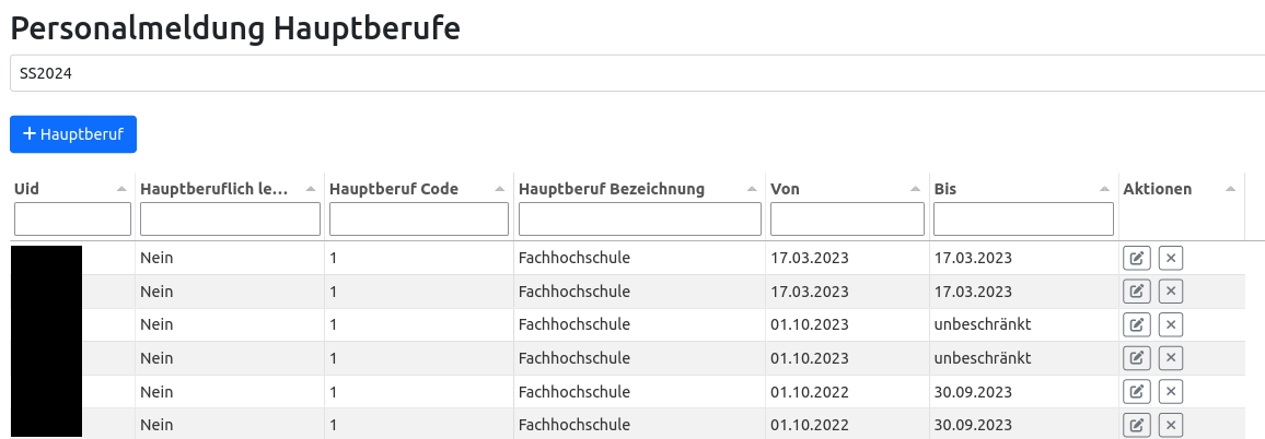 Hier können die zu meldeten Hauptberufdaten für ein Jahr (markiert durch das abschließende Studiensemester) angezeigt und verändert werden. Dies betrifft die Information, ob MitarbeiterInnen hauptberuflich lehrend sind oder die Lehrtätigkeit nur ein Nebenberuf ist. Bei nebenberuflich Lehrenden muss der Hauptberuf (mittels Code) angegeben werden.