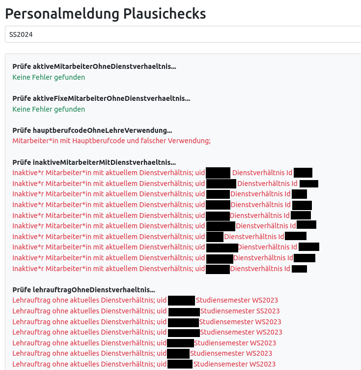 Hier können Personalmeldung Plausichecks ausgeführt werden. Plausichecks sind Prüfungen auf Vollständigkeit und Validität der Personaldaten und werden für ein Jahr (markiert durch das abschließende Studiensemester) ausgeführt.